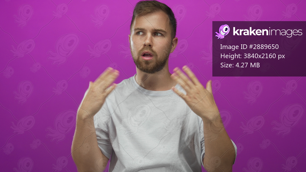 Young caucasian man gripping a white t shirt with both hands and closed eyes in a magenta studio; relief.