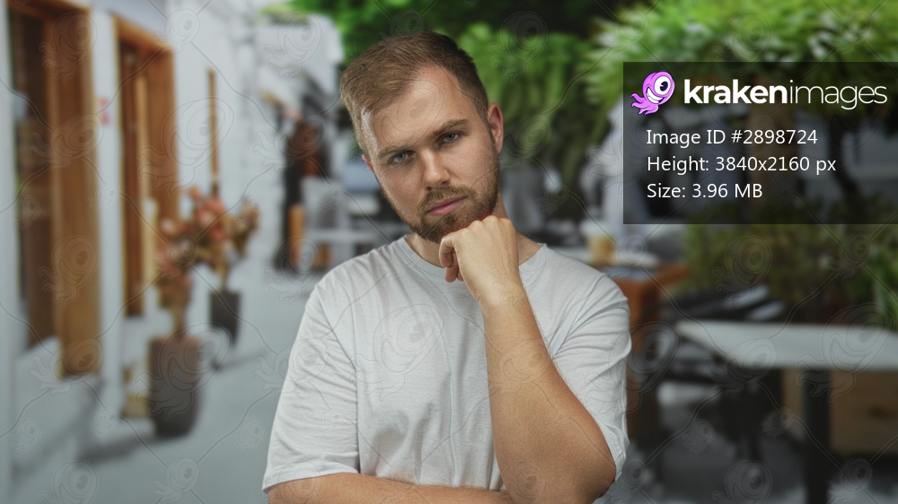 Young caucasian man with hand on chin at a street cafe, wearing white tshirt and eyes closed in pensive pose; thoughtful.