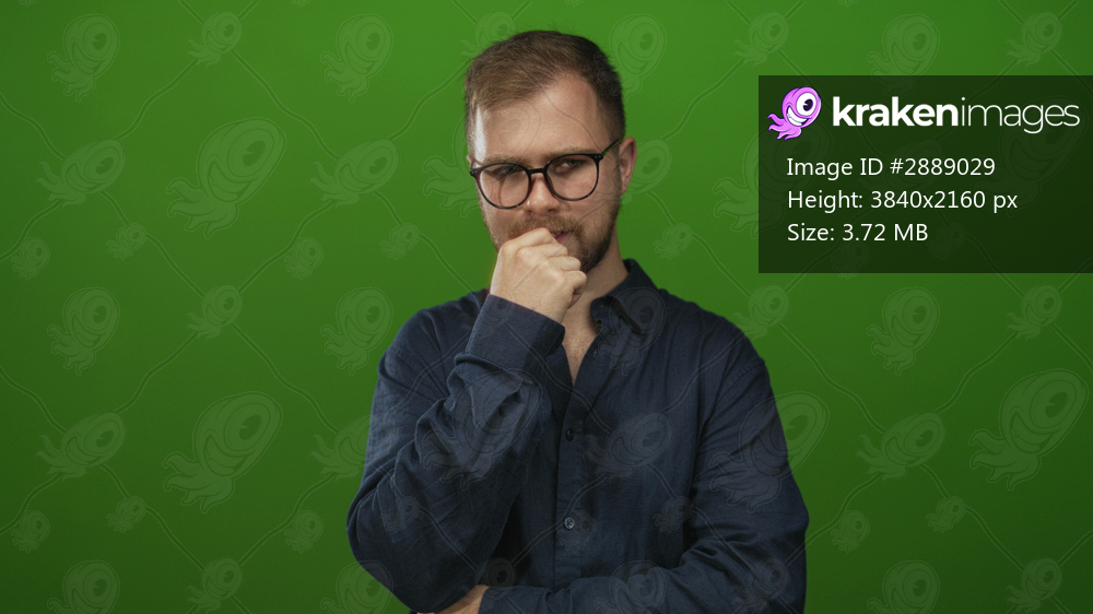 Young caucasian man with hand on chin pensive gesture in green studio, wearing glasses and navy shirt; contemplation.