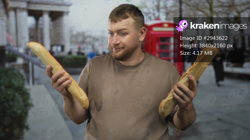 Young caucasian man holding two large baguettes on a busy city street beside a red phonebox, hands raised in a shrugging gesture; indecision.