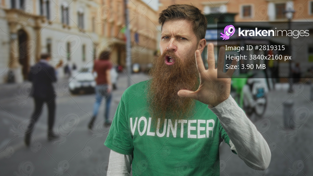 Young caucasian man in green volunteer shirt smiles and points finger on city street; community support compassion.