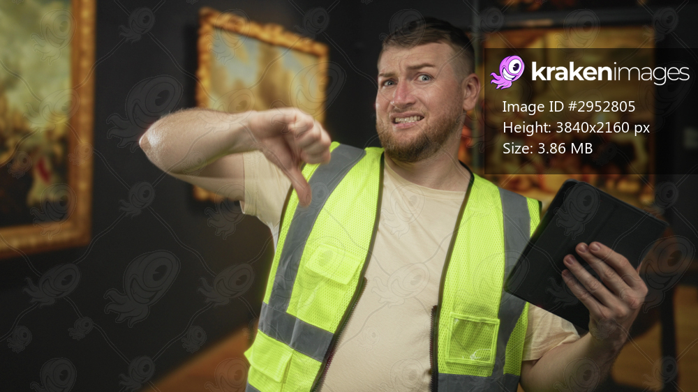 Young caucasian man in high visibility yellow vest gives thumbs down while holding tablet among paintings in building; frustration doubt uncertainty.