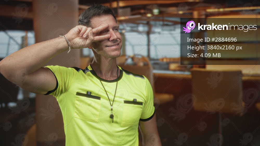 Young caucasian man in neon yellow referee shirt with whistle and lanyard making peace sign over eye in building restaurant interior; playful confidence. - Kraken Images
