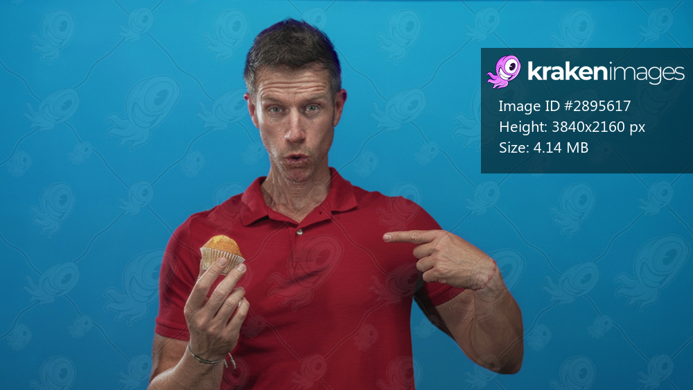 Young caucasian man in red polo holding a muffin points finger to chest in blue studio; playful curiosity.