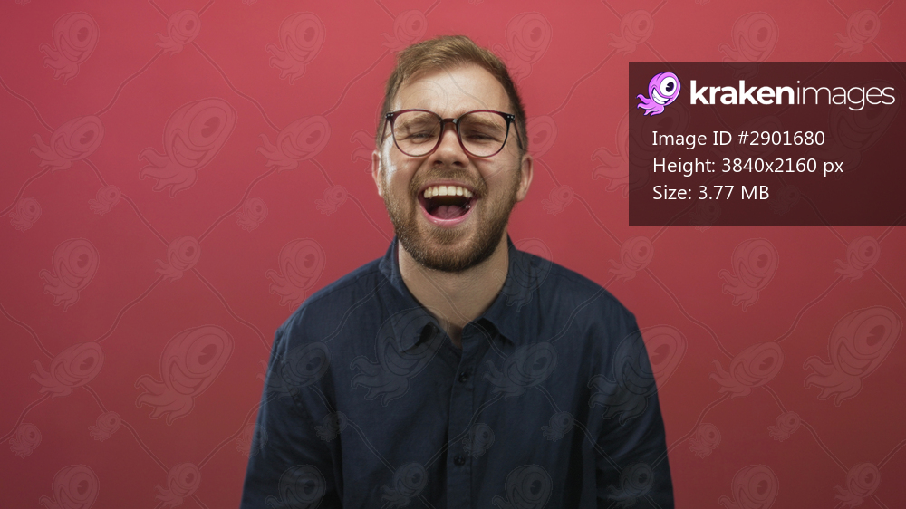Young caucasian man laughing with open mouth and glasses, beard visible, head tilted back wearing navy shirt in studio with red backdrop; joy.