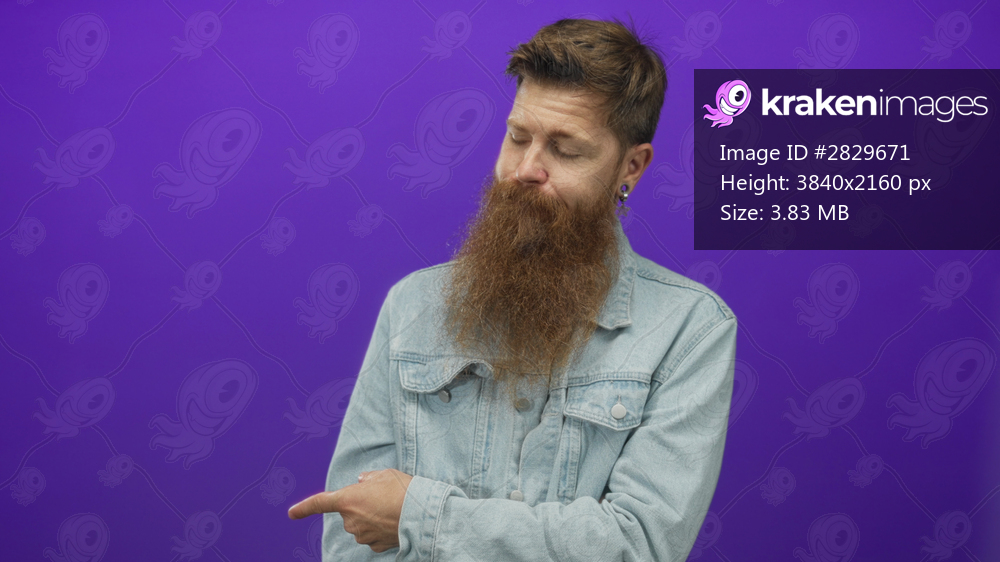 Young caucasian man with long beard and denim jacket pointing finger to side in studio; skepticism.
