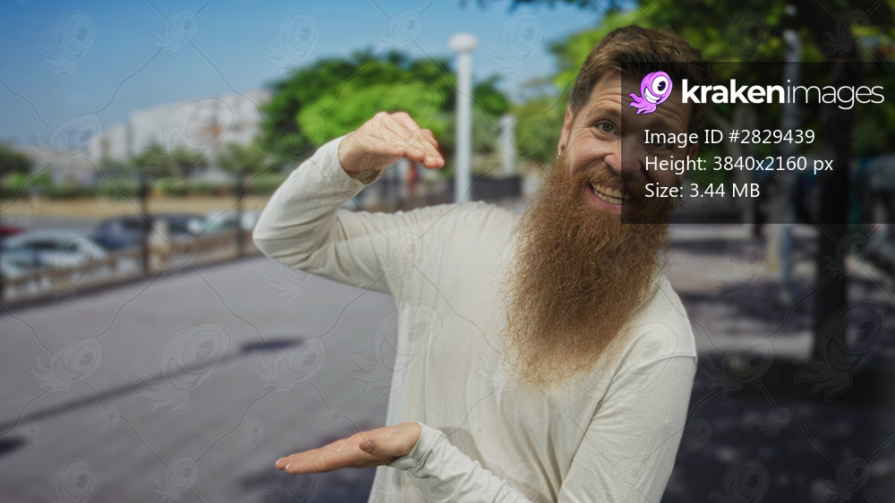 Young caucasian man with long beard gesturing large size with outstretched hands on sunny street; amusement.