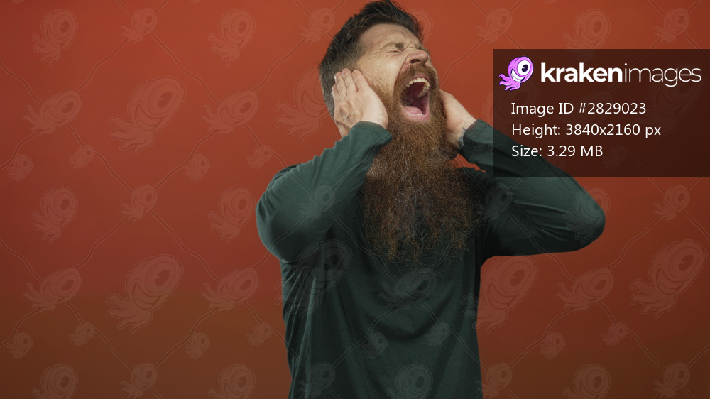 Young caucasian man with long beard shouting with hands on ears in studio with red background; frustration anger.