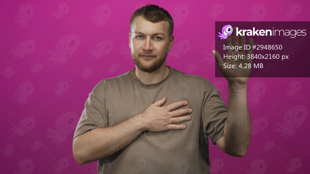 Young caucasian man placing hand on chest and raising the other palm in a magenta studio; honor commitment integrity.