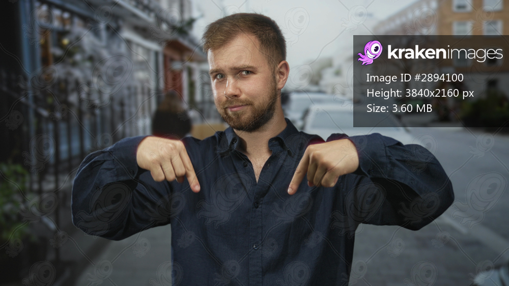 Young caucasian man pointing both index fingers downward toward camera on urban street with a questioning smirk; skepticism doubt.