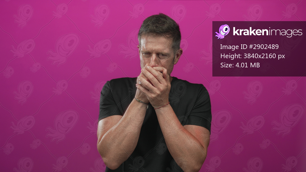 Young caucasian man pressing hands to mouth while coughing in studio against vivid pink wall; anxiety health concern.