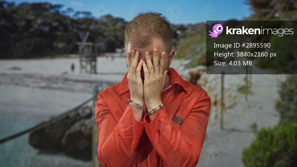 Young caucasian man prisoner in orange jumpsuit handcuffed, hands covering face in studio; despair solitude.