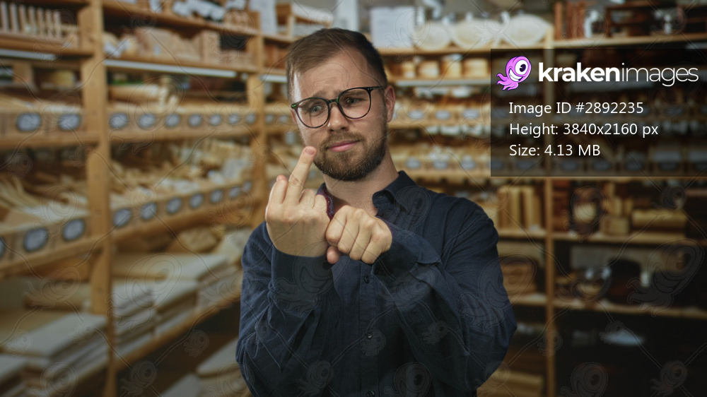 Young caucasian man shows middle finger in shop building aisle filled with wooden shelves and goods; defiance protest.