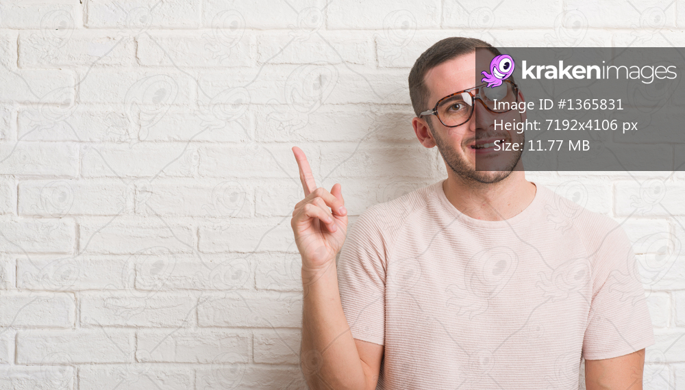 Young caucasian man standing over white brick wall wearing glasses very happy pointing with hand and finger to the side