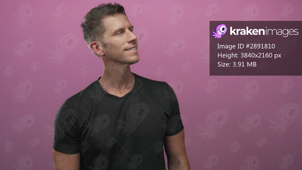 Young caucasian man tilting head and smiling with exposed neck wearing black t shirt in pink studio; confidence.