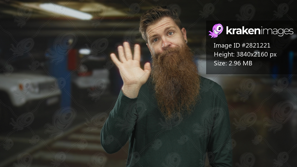 Young caucasian man waves hand beside white car inside dimly lit parking building under fluorescent lights; friendly greeting.