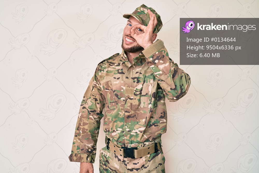 Young caucasian man wearing camouflage army uniform doing ok gesture with hand smiling, eye looking through fingers with happy face.