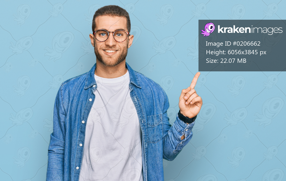 Young caucasian man wearing casual clothes with a big smile on face, pointing with hand finger to the side looking at the camera.