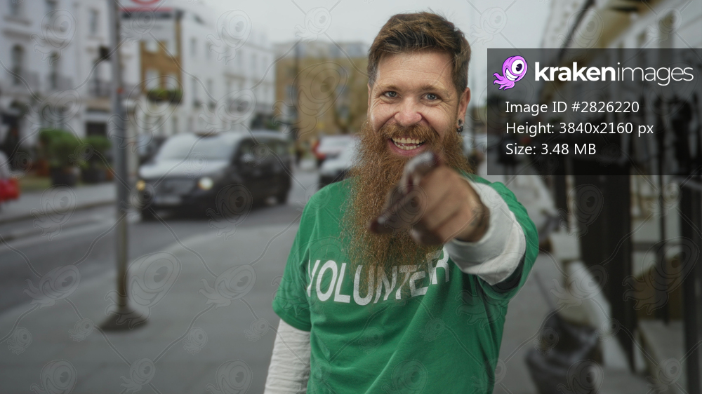 Young caucasian man wearing green volunteer shirt points finger in busy street; community engagement.