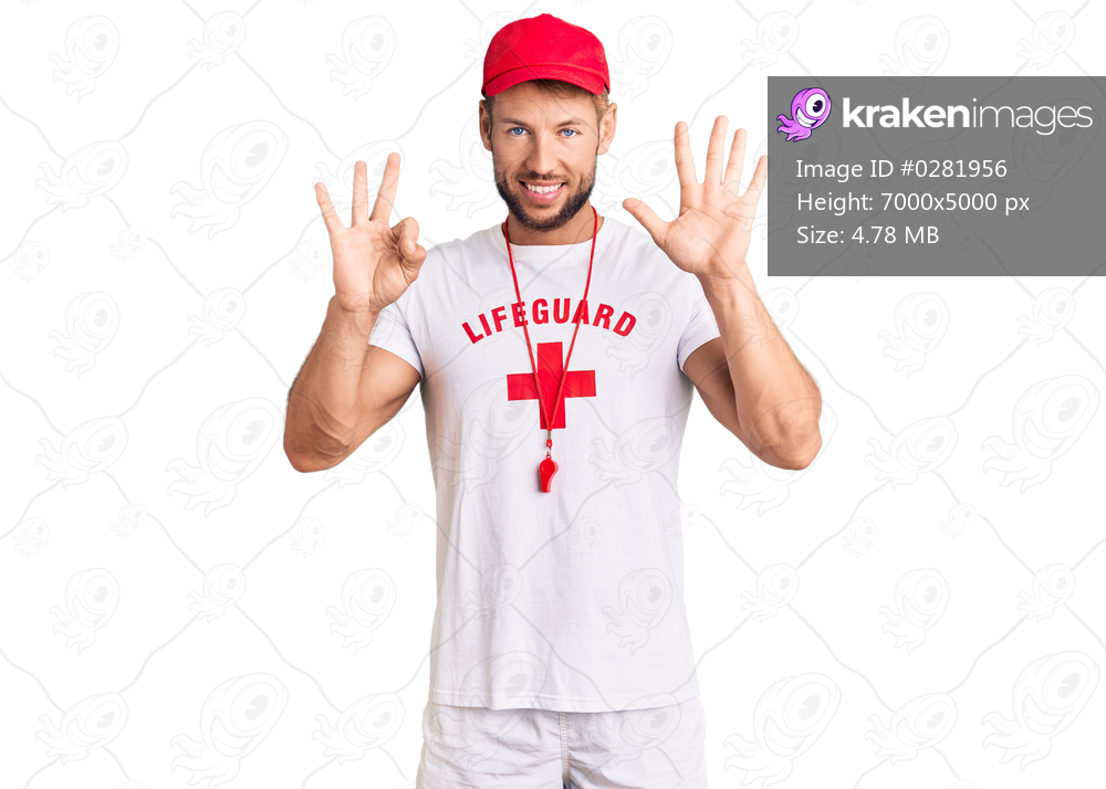 Young caucasian man wearing lifeguard t shirt holding whistle showing and pointing up with fingers number eight while smiling confident and happy.