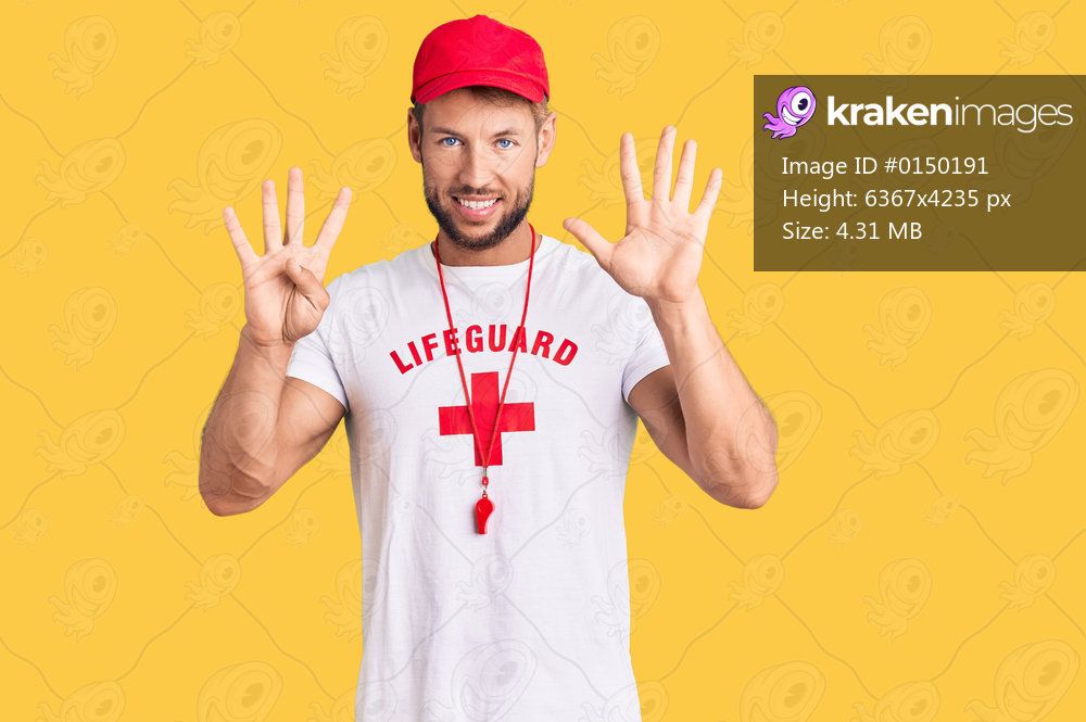 Young caucasian man wearing lifeguard t shirt holding whistle showing and pointing up with fingers number nine while smiling confident and happy.