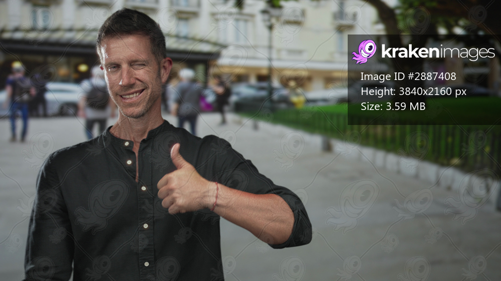 Young caucasian man winks and presents open palms at a building entrance on a street; friendly invitation.
