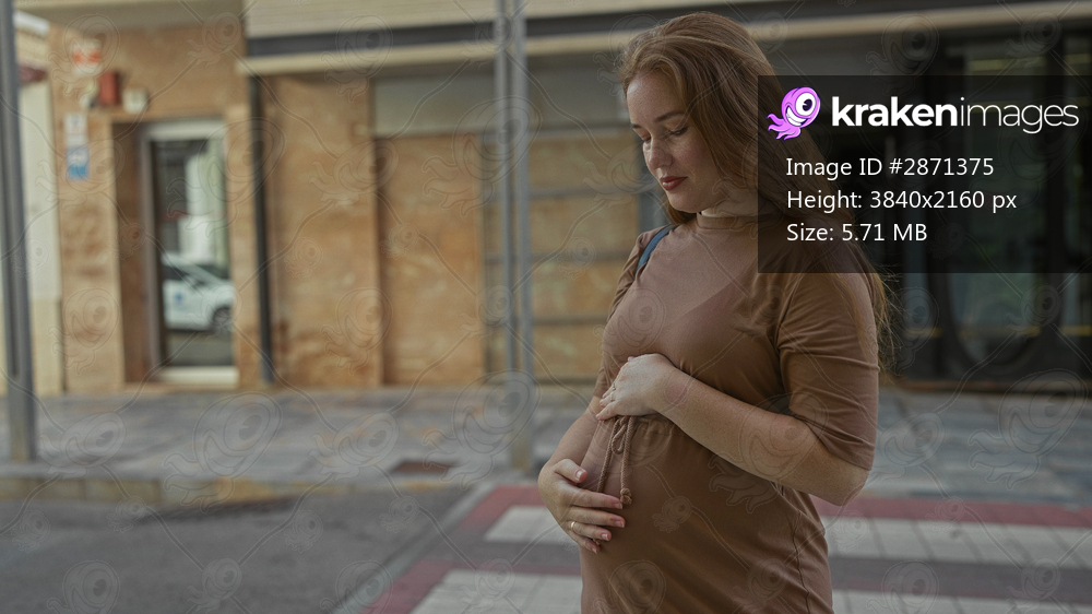 Young caucasian pregnant woman gently holding belly on city street with blurred storefronts and tiled pavement under soft daylight; serenity.