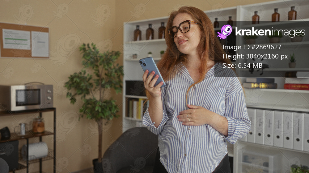 Young caucasian pregnant woman gently holds her belly and speaks on phone in office building; anticipation.