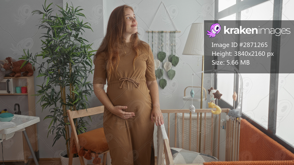 Young caucasian pregnant woman gently touches belly next to wooden crib in building; family love anticipation.