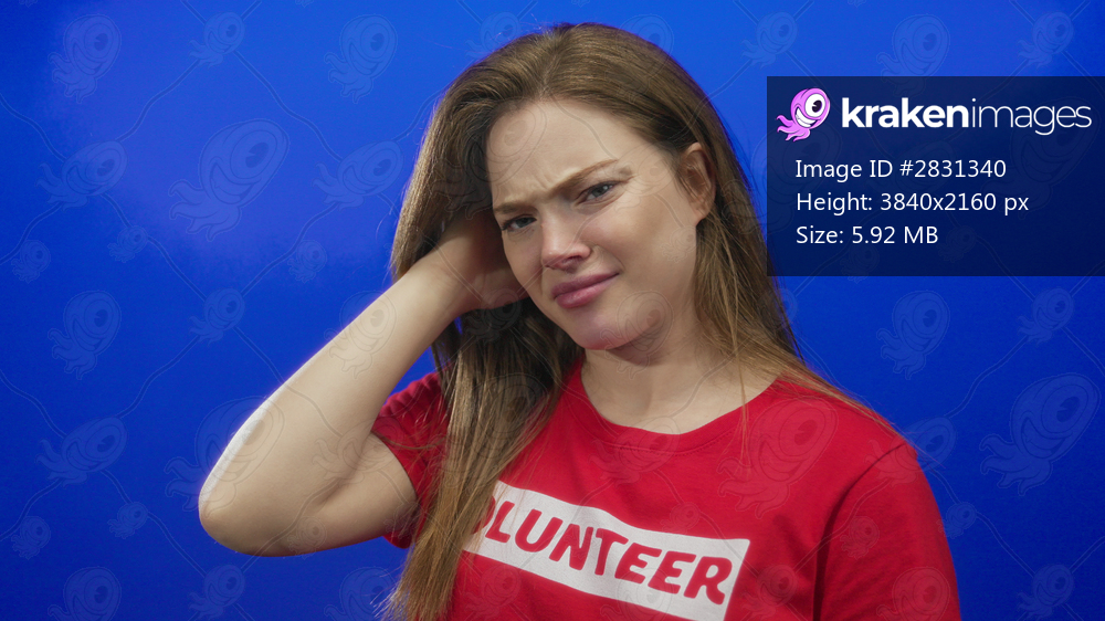 Young caucasian volunteer woman holds hand on neck in studio featuring blue wall while grimacing; discomfort.