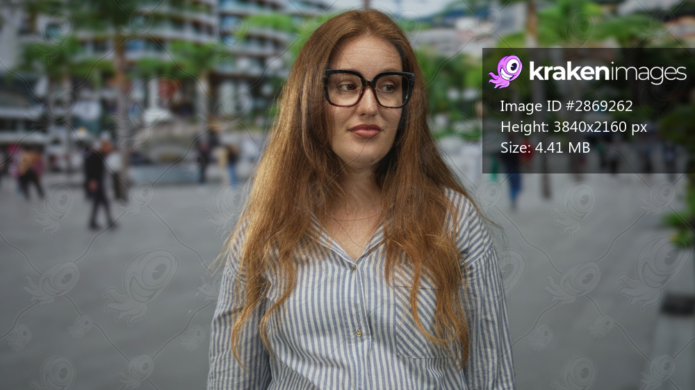 Young caucasian woman adjusts glasses and raises hand in crowded downtown pedestrian street; uncertainty.