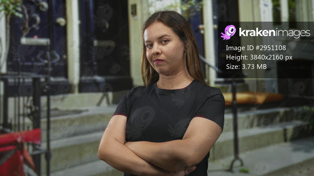 Young caucasian woman with arms crossed on building steps by iron railing and doorway; defiance stubbornness.