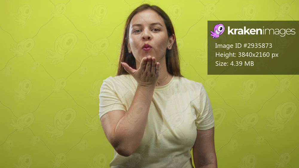 Young caucasian woman blows a kiss with hand to camera in lime green studio, wearing a pale shirt and centered frame; affection greeting.