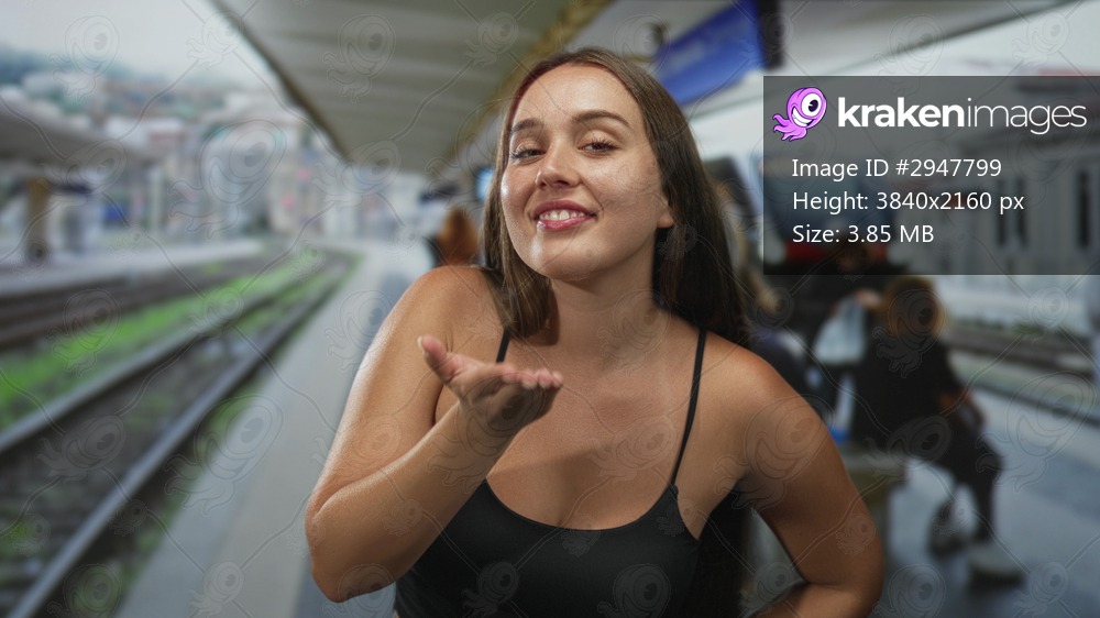 Young caucasian woman blows kiss with hand and smiles on train platform building, wearing black tank top showing shoulders; playful affection.