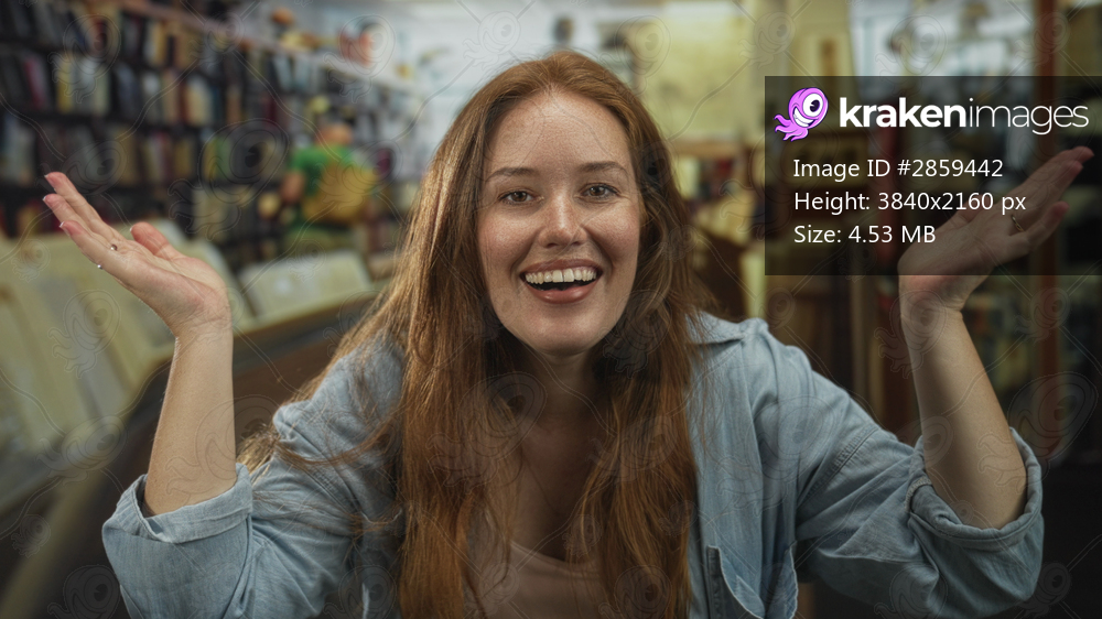 Young caucasian woman with bright smile makes hand binoculars gesture in library; playful curiosity.