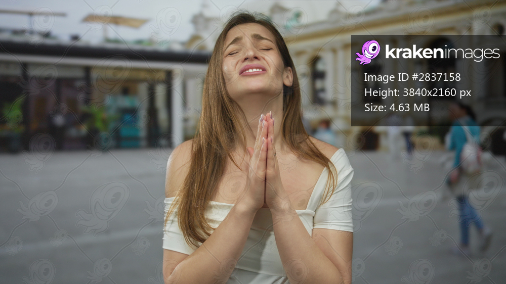 Young caucasian woman with closed eyes praying with clasped hands in a bustling urban street; devotion.