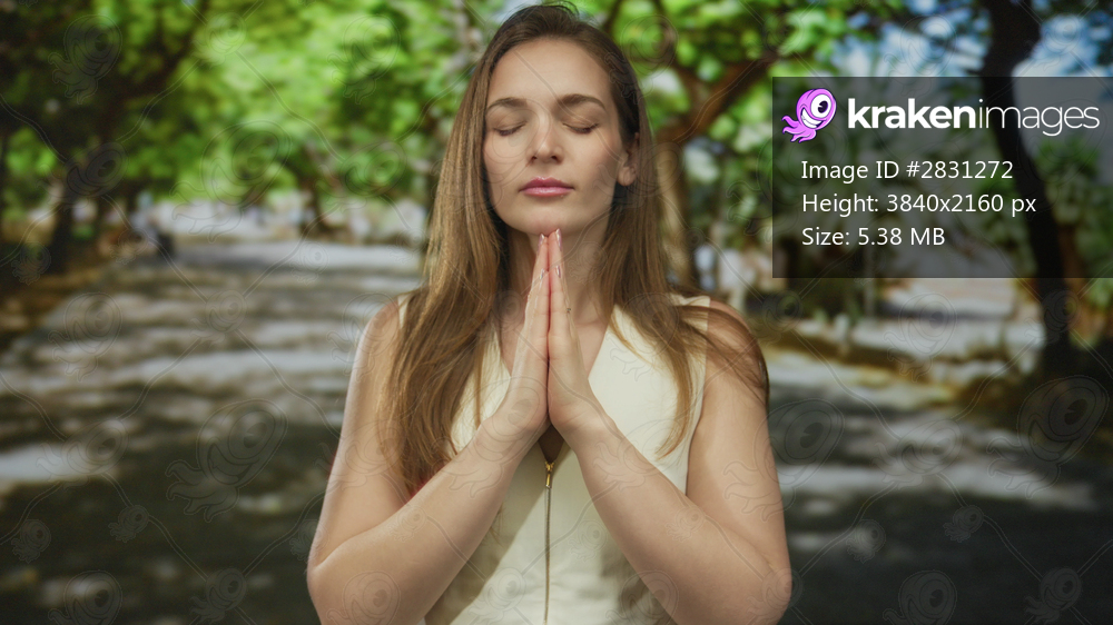 Young caucasian woman with closed eyes presses palms together in prayer gesture on green forest path; serenity.