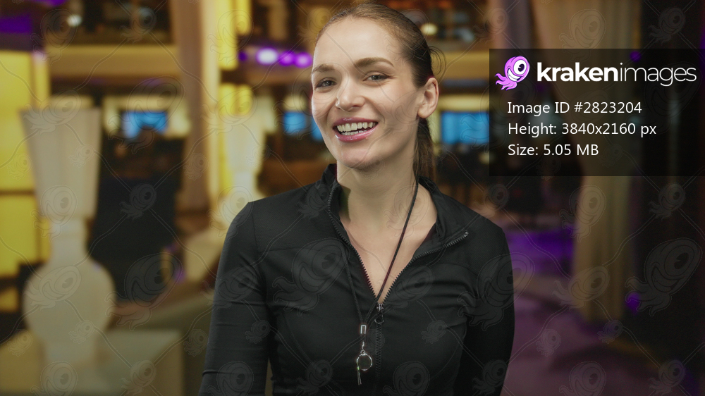 Young caucasian woman coach with whistle lanyard holds finger to lips for silence in building lounge; quiet confidence.