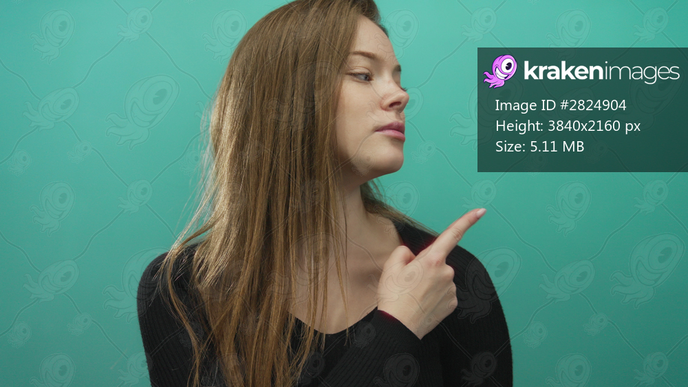 Young caucasian woman confidently glancing aside and pointing right index finger in teal studio; curiosity.