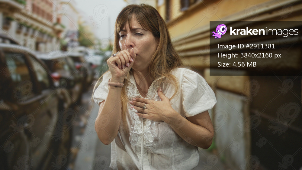 Young caucasian woman coughing into fist while clutching chest on a busy city street near parked cars and a building facade; health concern.