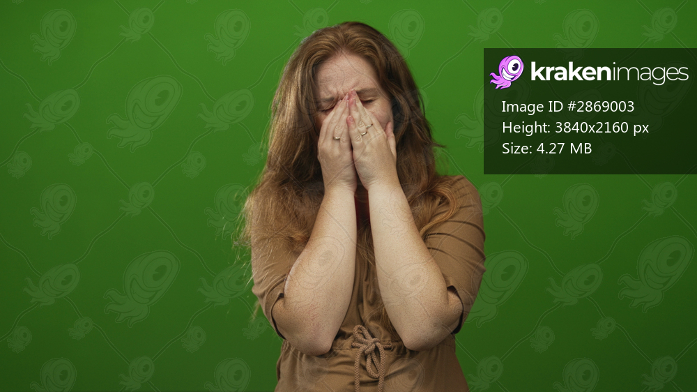 Young caucasian woman covering face with hands in green studio backdrop, hair falling over shoulders and freckled skin; disgust.