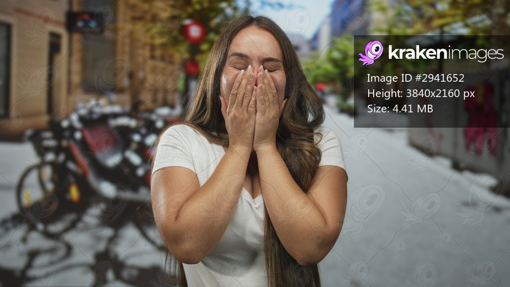 Young caucasian woman covering face with hands on street, wearing white t shirt and long hair pulled to one side; raw sadness.