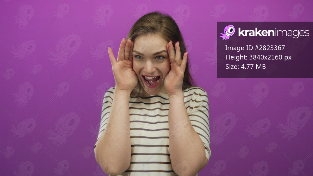 Young caucasian woman covering face with hands wearing striped shirt in purple studio; shyness vulnerability.