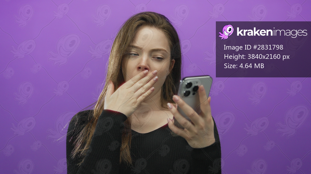 Young caucasian woman covering mouth in yawn gesture while holding smartphone in purple studio lighting and wearing black sweater; fatigue.
