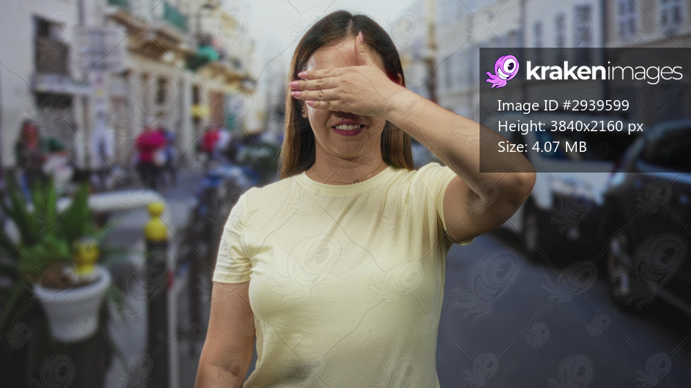 Young caucasian woman covers eyes with hand in a crowded city street between parked cars and sidewalk planters; shyness privacy.