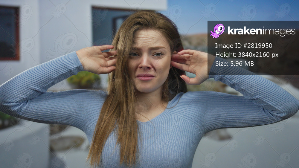 Young caucasian woman covers her ears with both hands at building entrance under bright sunlight; discomfort.
