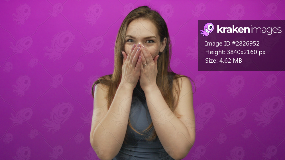Young caucasian woman covers mouth with both hands while smiling in studio during playful moment; surprise.