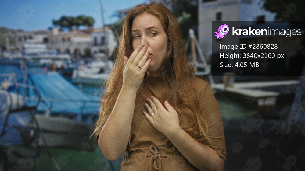 Young caucasian woman covers mouth with hand beside blue boat at white building; seasickness discomfort.