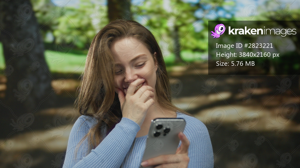 Young caucasian woman covers mouth with hand while holding smartphone in forest; lighthearted amusement.