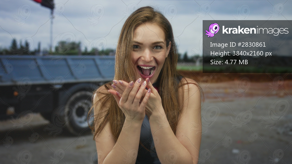 Young caucasian woman covers mouth with hands in front of truck on busy street under overcast sky; surprise wonder.